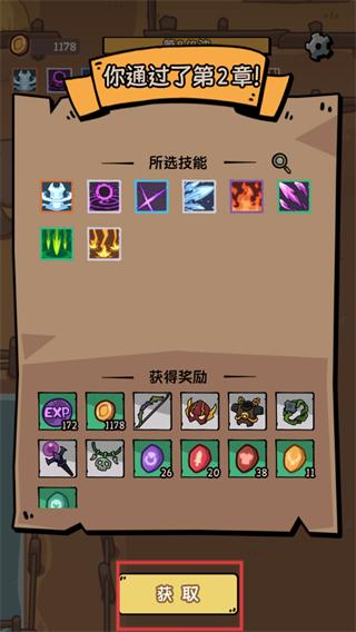 2、通过章节后点击获取,领取所选技能和装备、金币等奖励,积累资源用于角色和技能的成长。