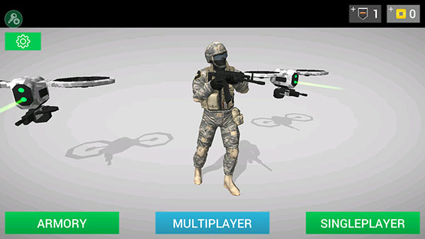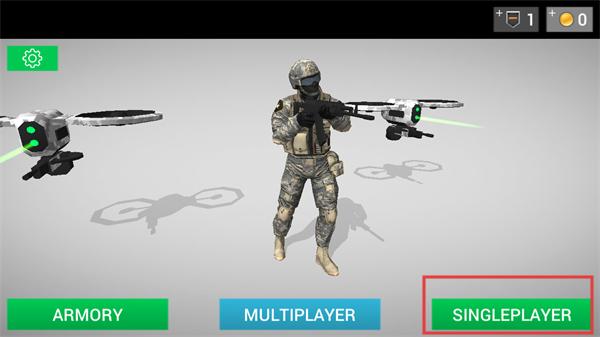 1、进入游戏主界面,能看到ARMORY、MULTIPLAYER、SINGLEPLAYER三个按钮,点击SINGLEPLAYER可开启单人剧情模式,界面还显示资源数量与设置选项。
