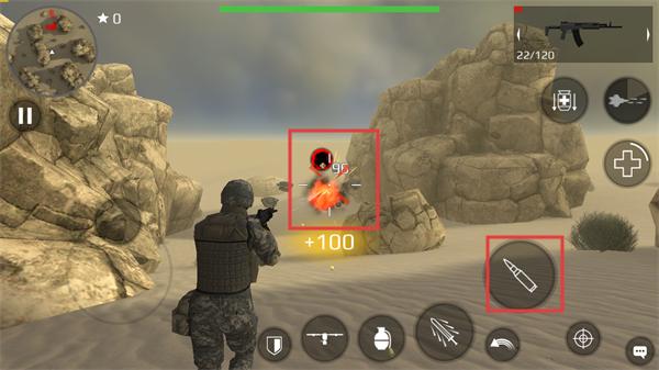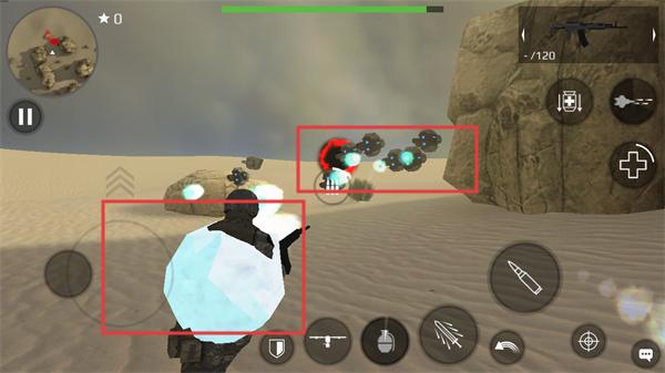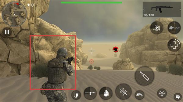 2、在沙漠战斗场景中通过左侧虚拟摇杆移动角色,右侧按钮控制射击、换弹等操作,小地图可查看敌人位置,利用岩石掩护靠近敌人准备发起攻击。