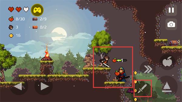 3、遇到敌人时发动攻击,同时收集苹果等物品,利用投掷苹果的攻击方式,应对魔法师、战士等不同类型敌人,推进关卡进程。