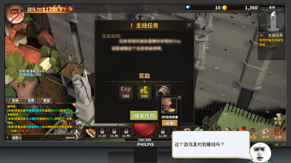 2、主线任务启成长:点击右侧主线任务接取并完成,获取经验、金币与装备,推动角色升级。
