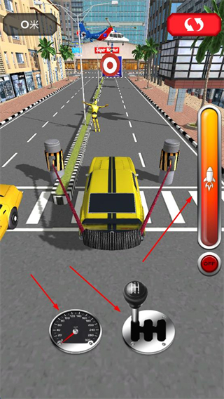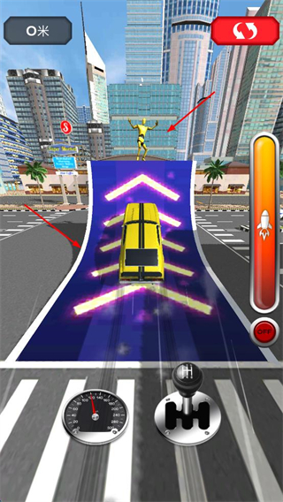 2、游戏关卡内可以操控速度表和换挡杆行驶,遇火箭加速道具及时用,靠近坡道提前加速飞跃。