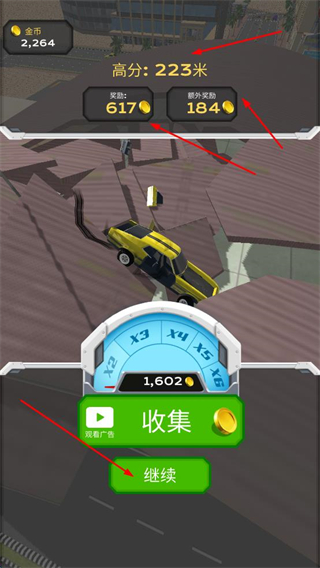 4、关卡结束后,根据高分领取奖励金币,点收集或者看广告翻倍,积累金币后可继续挑战。