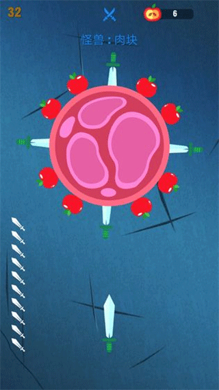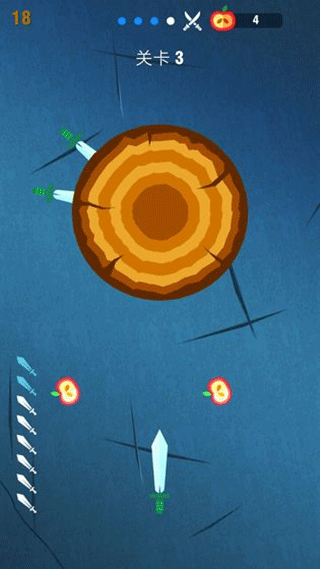 2、把握节奏射出飞刀,确保不与其他已插入的飞刀碰撞,同时尝试命中树轮上的苹果。