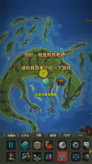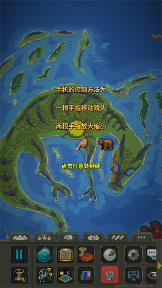 1、点击任意处继续,进入游戏主界面,后续可用一根手指移动镜头,两根手指放大缩小地图。