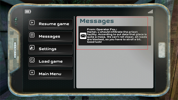 1、点击Messages选项查看消息内容,获取潜入监狱设施的任务提示,明确当前行动目标。