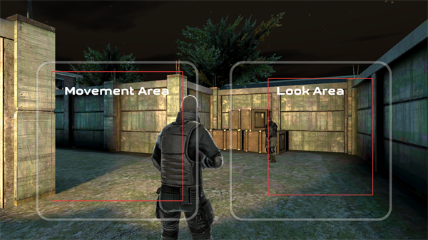 2、在Movement Area区域操控角色移动,同时通过Look Area观察周围环境,留意敌人动向。