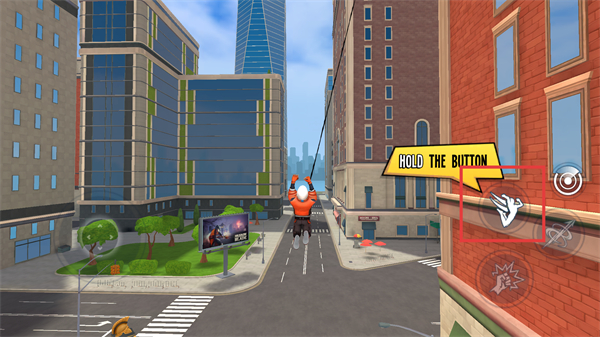 1、按照提示长按对应按钮,操控角色进行高空摆荡移动,在城市建筑间穿梭,推进逃脱或探索流程。