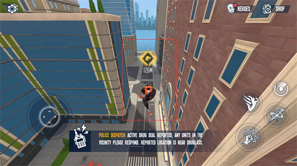 2、持续操控角色摆荡前进,界面显示当前移动距离,同时触发警方通报提示,增加场景的紧张氛围。