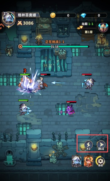 2、开启冒险闯关:点击主界面右下角“冒险”入口,选择关卡点击“挑战”开启战斗,英雄将自动作战,可开启倍速提升效率。