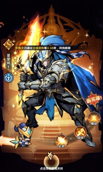 3、领取挂机收益:通关关卡后解锁挂机收益,定期点击冒险界面宝箱图标领取,用于英雄升级与进阶,快速提升战力。