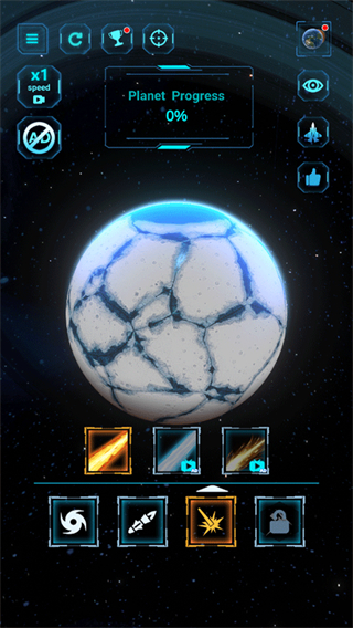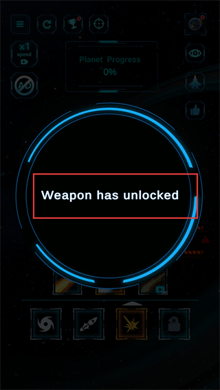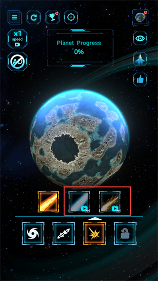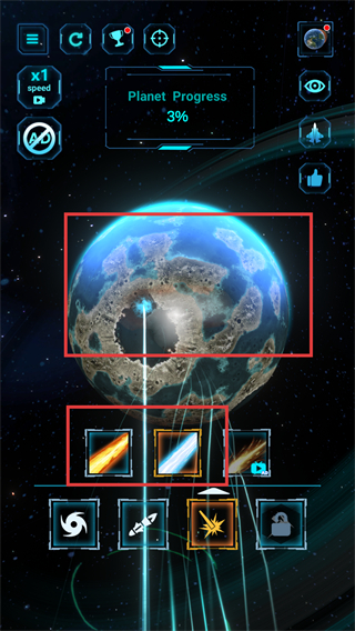 4、使用解锁的武器攻击星球,观察星球出现的破损变化,同时Planet Progress数值上升至3。