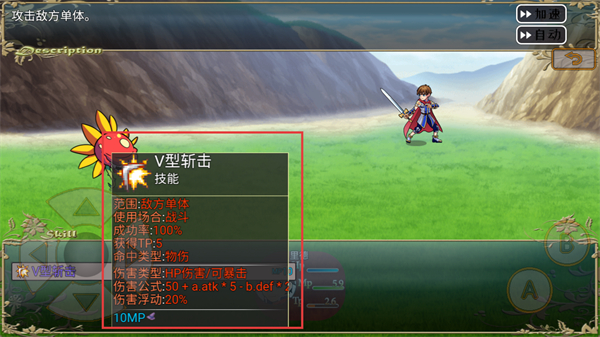 3、选择技能选项释放V型斩击,该技能会对敌方单体造成伤害,同时消耗角色对应的MP数值。