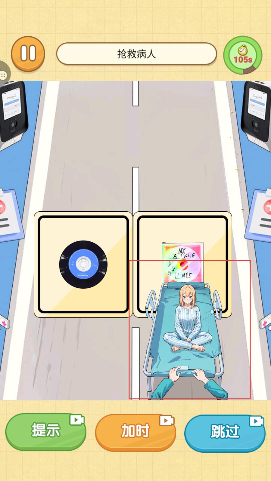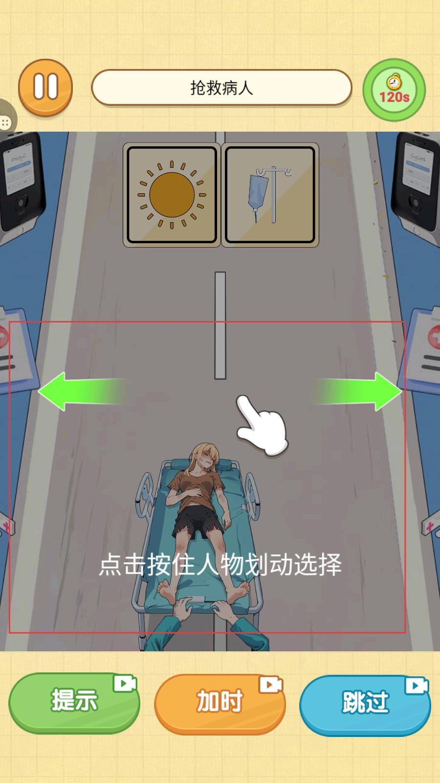 1、进入游戏后,面对抢救病人关卡,按提示点击按住人物划动选择,开始紧张的游戏挑战。