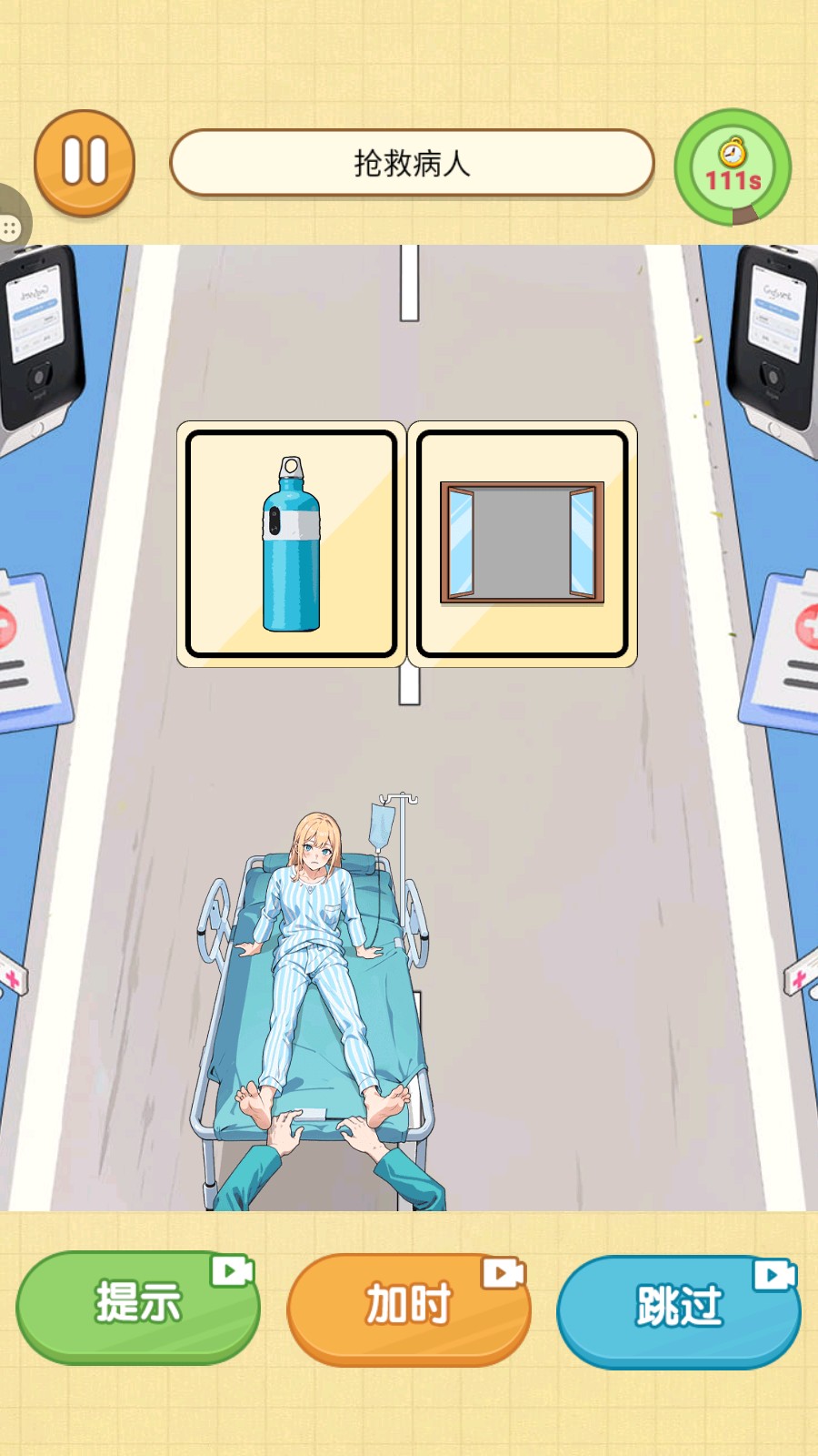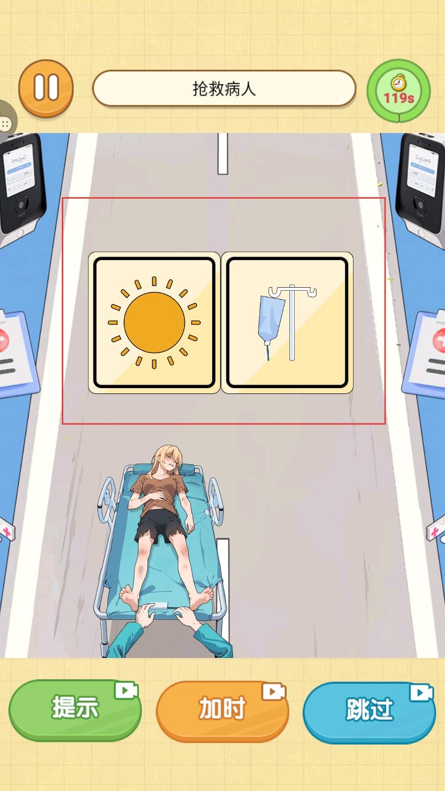 2、游戏中上方会显示倒计时,需在规定时间内,根据病人情况,选择如太阳、输液架等合适图标来施救。