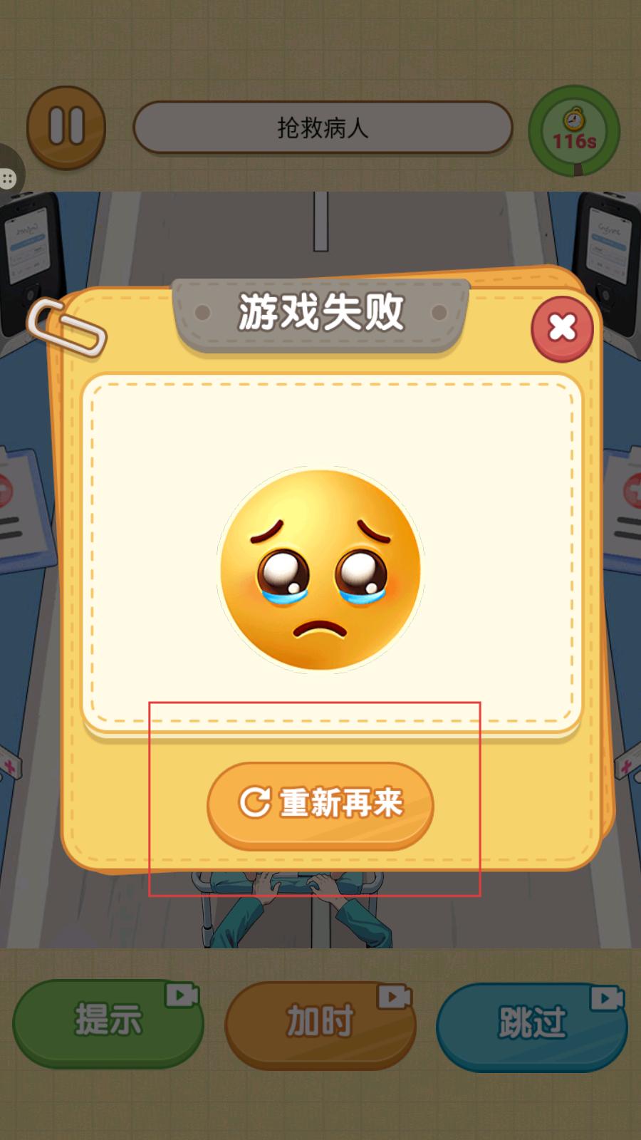 4、若未能成功抢救病人,出现游戏失败界面,点击重新再来,就能再次挑战,努力完成关卡。