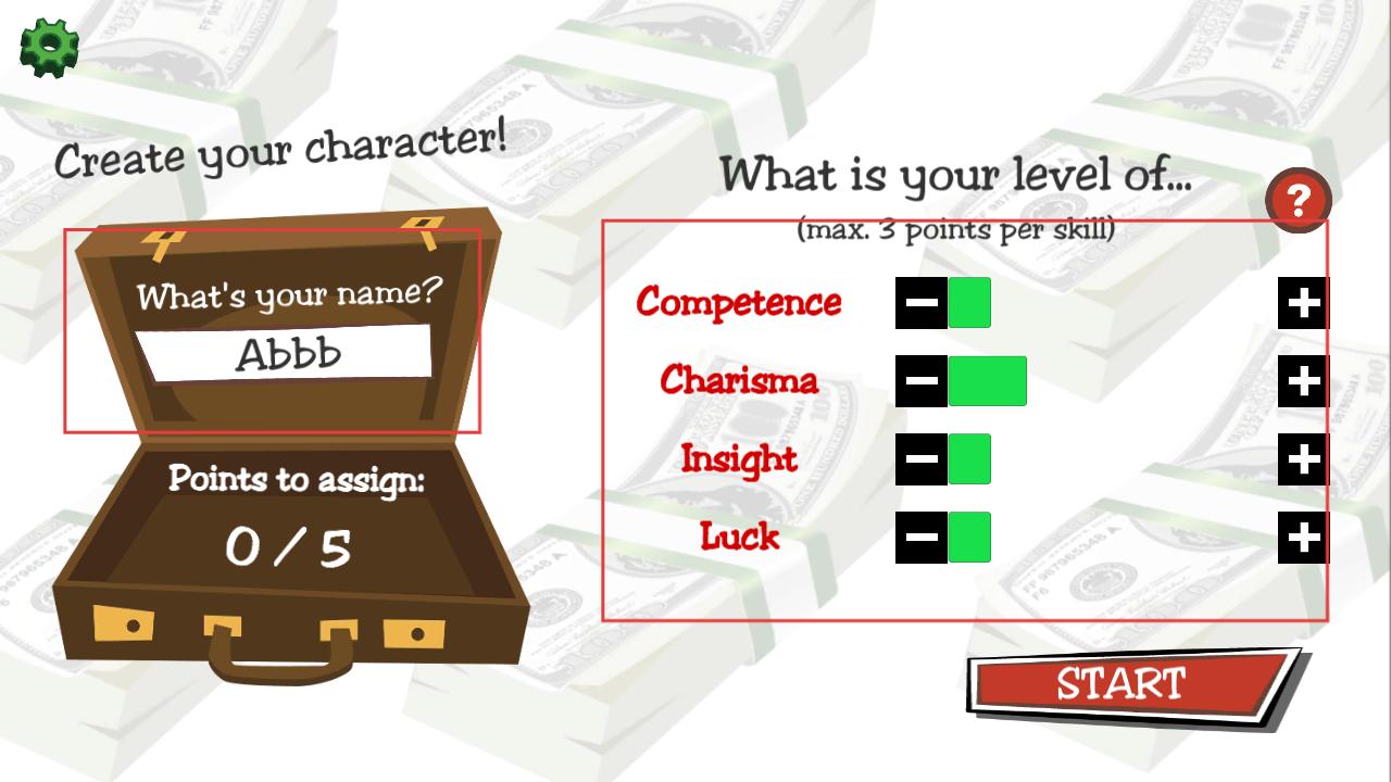 2、进入创建角色环节,在输入框输入名字,然后在Competence、Charisma等技能属性栏分配点数,分配完毕点击START。