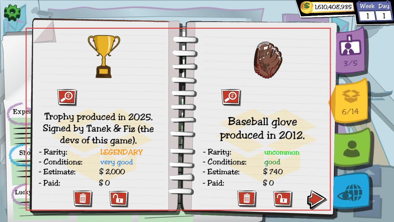 3、经营过程中会查看各种典当物品,像奖杯、棒球手套等,了解其生产年份、稀有度、状况和估价等信息,决定是否收下物品。