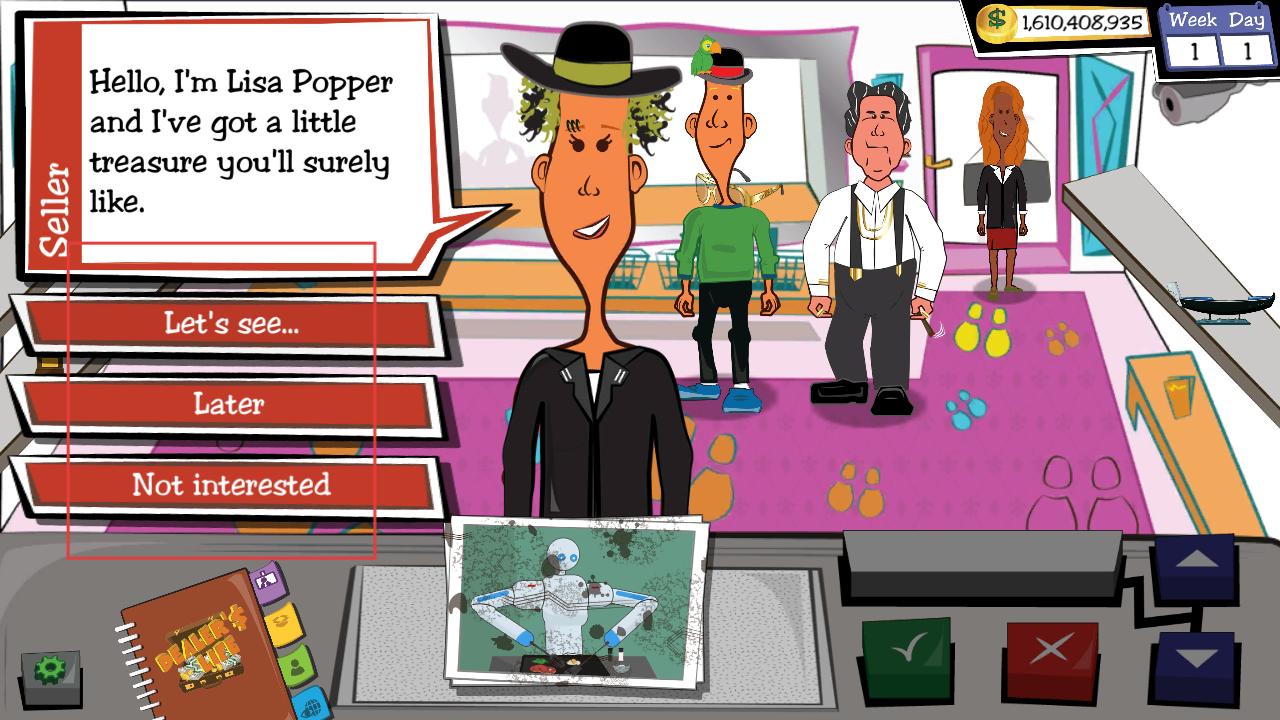 4、面对前来售卖物品的顾客,比如Lisa Popper,会听到其推销话语,可点击Lets see、Later等按钮做出回应,完成交易博弈。