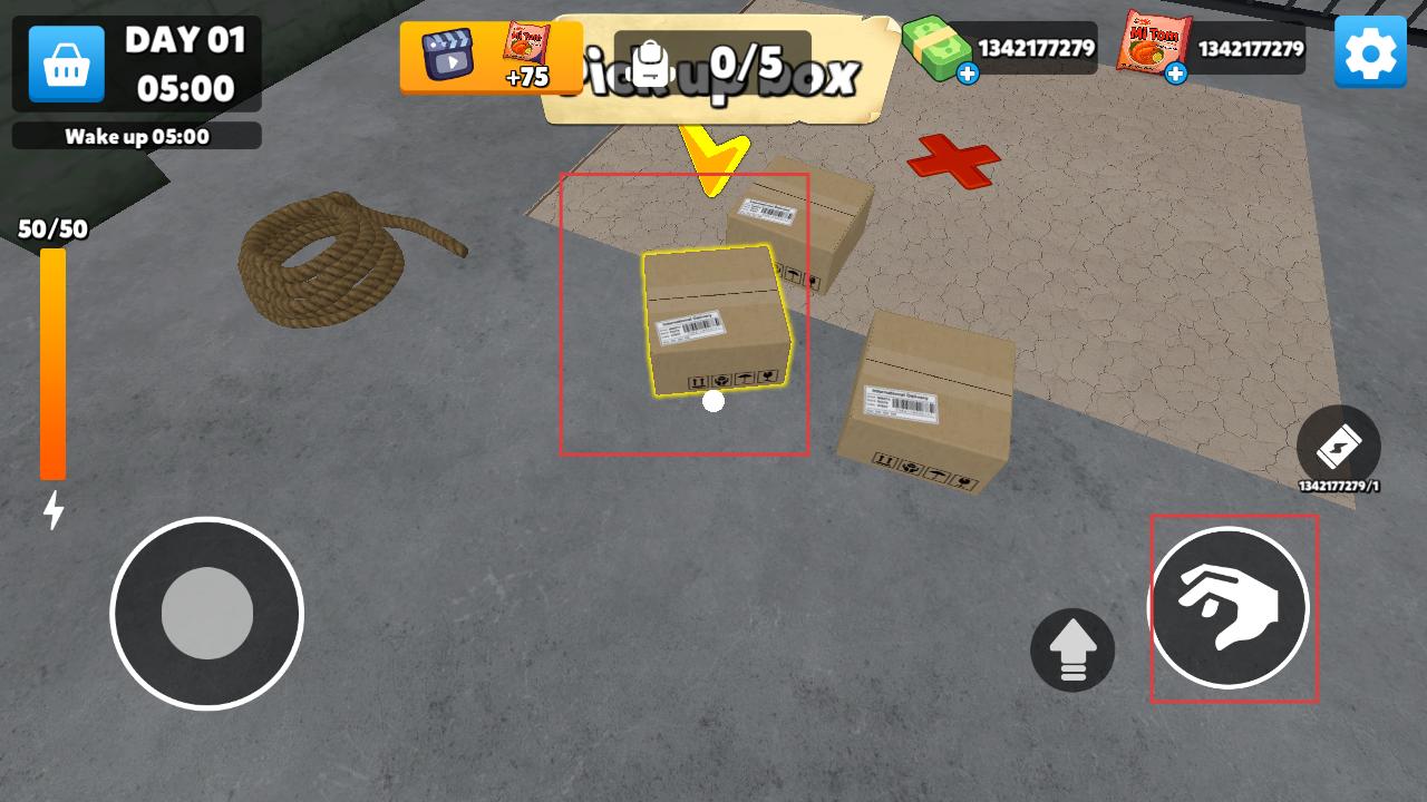 1、进入游戏,在指定区域,通过左侧虚拟摇杆移动角色,靠近纸箱后点击抓取按钮,收集物品。