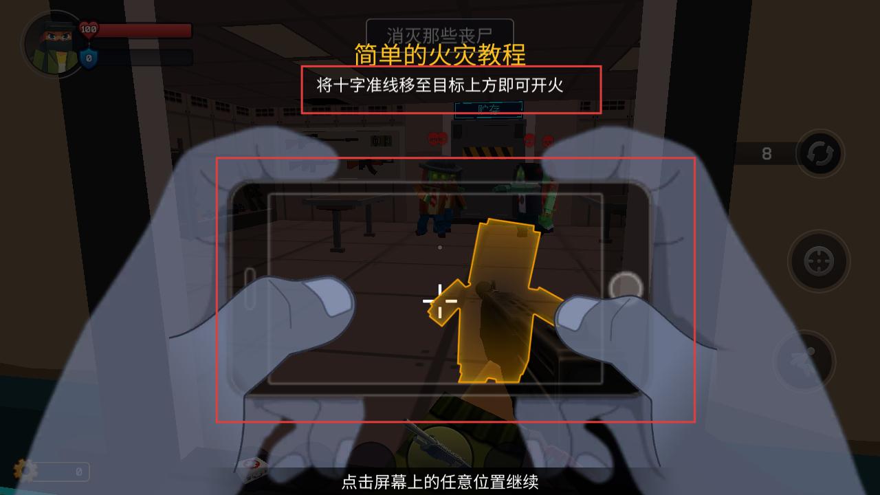 3、有简单的开火教程,将十字准线移至目标上方即可开火,按照教程学习射击,为消灭僵尸做准备。