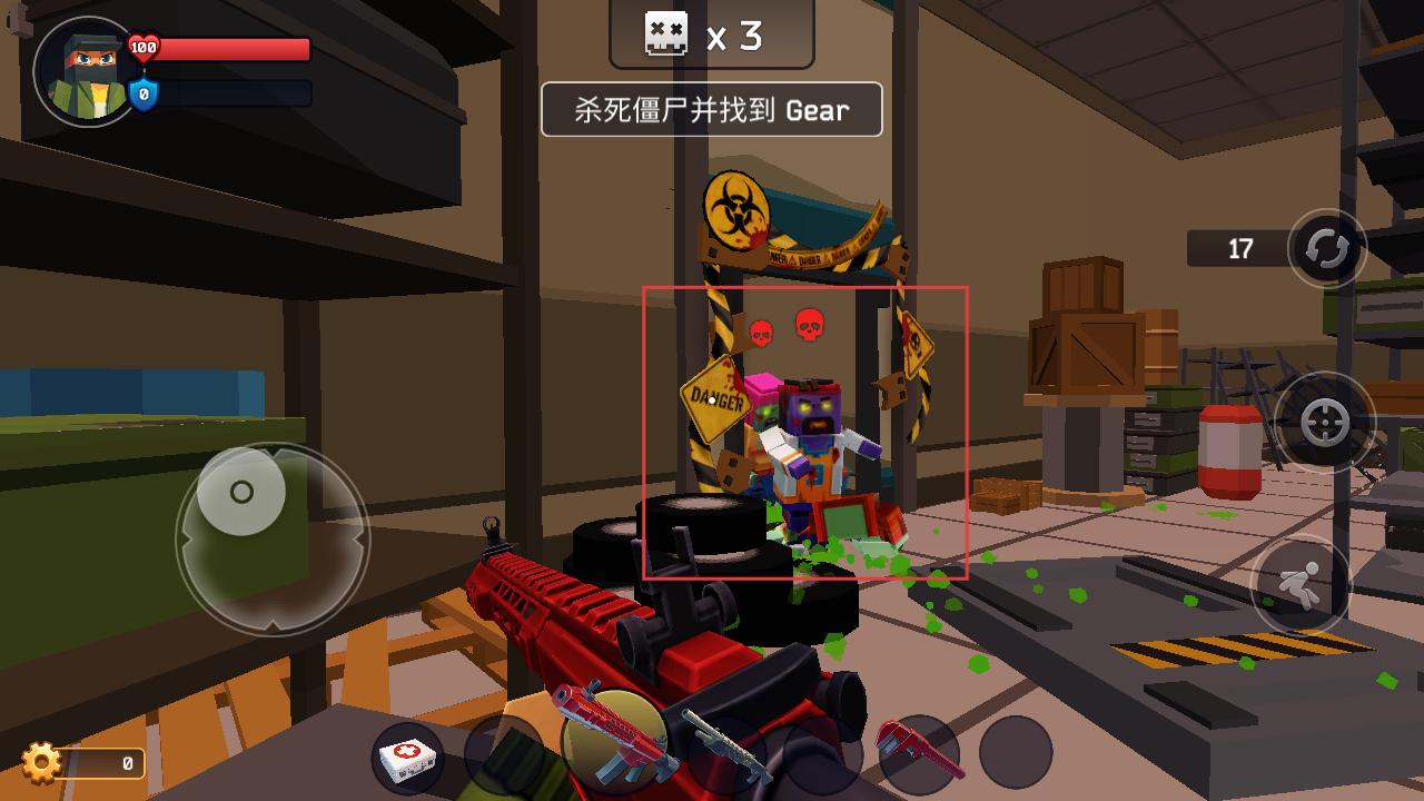 4、在仓库场景中需要杀死僵尸并找到Gear,面对出现的僵尸,用武器将其消灭,同时寻找Gear,完成任务。