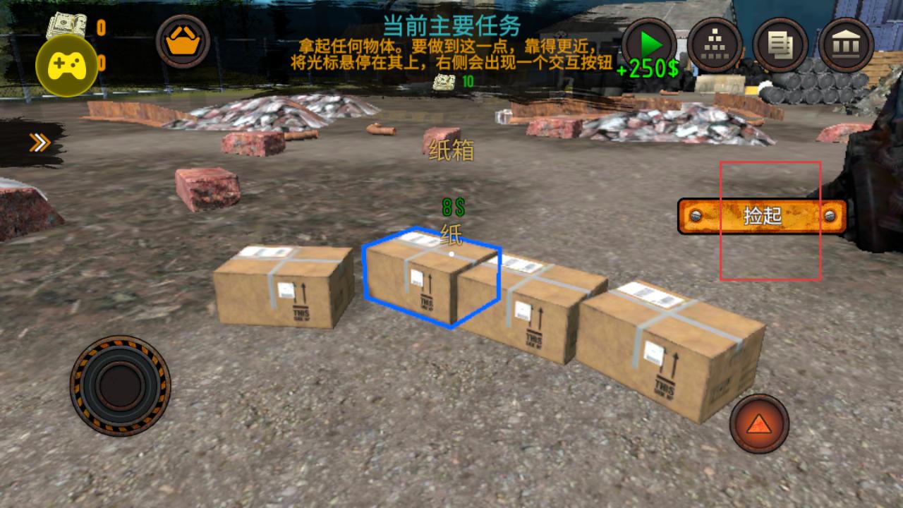 3、靠近纸箱等废品,点击捡起按钮收集,积累基础材料,这些材料可用于变卖或改造,助力垃圾场经营。