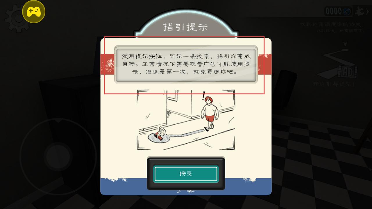 2、会弹出指引提示界面,说明使用提示按钮可获取解谜线索,首次免费,后续需观看广告,接受后借助线索能更顺利完成逃生目标,助力解谜进程。