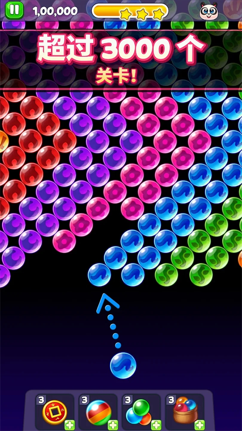 3、若遇到困难,使用游戏内丰富道具突破阻碍,在有限机会内持续消除泡泡,最终击败邪恶狒狒,解救熊猫宝宝。