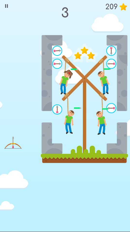 3、射出的箭矢,不用担心会射到小人,只要绳索被射断即可。