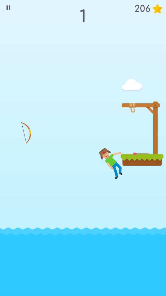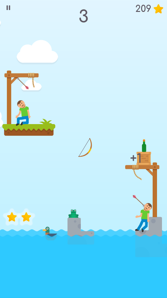1、游戏里,需按住屏幕向后滑动来拉弓射箭,箭头瞄准小人头上的绳子射击。