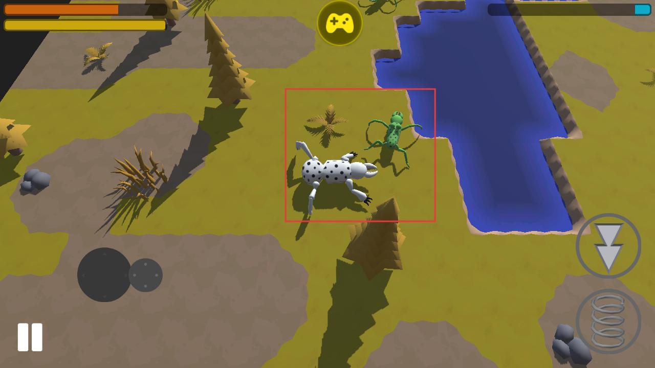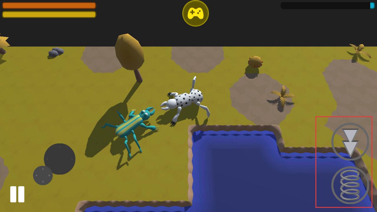 2、右侧有操作按钮,可控制昆虫行动,遇到其他昆虫时,借助按钮操作与之互动,在水域附近开展生存竞争。