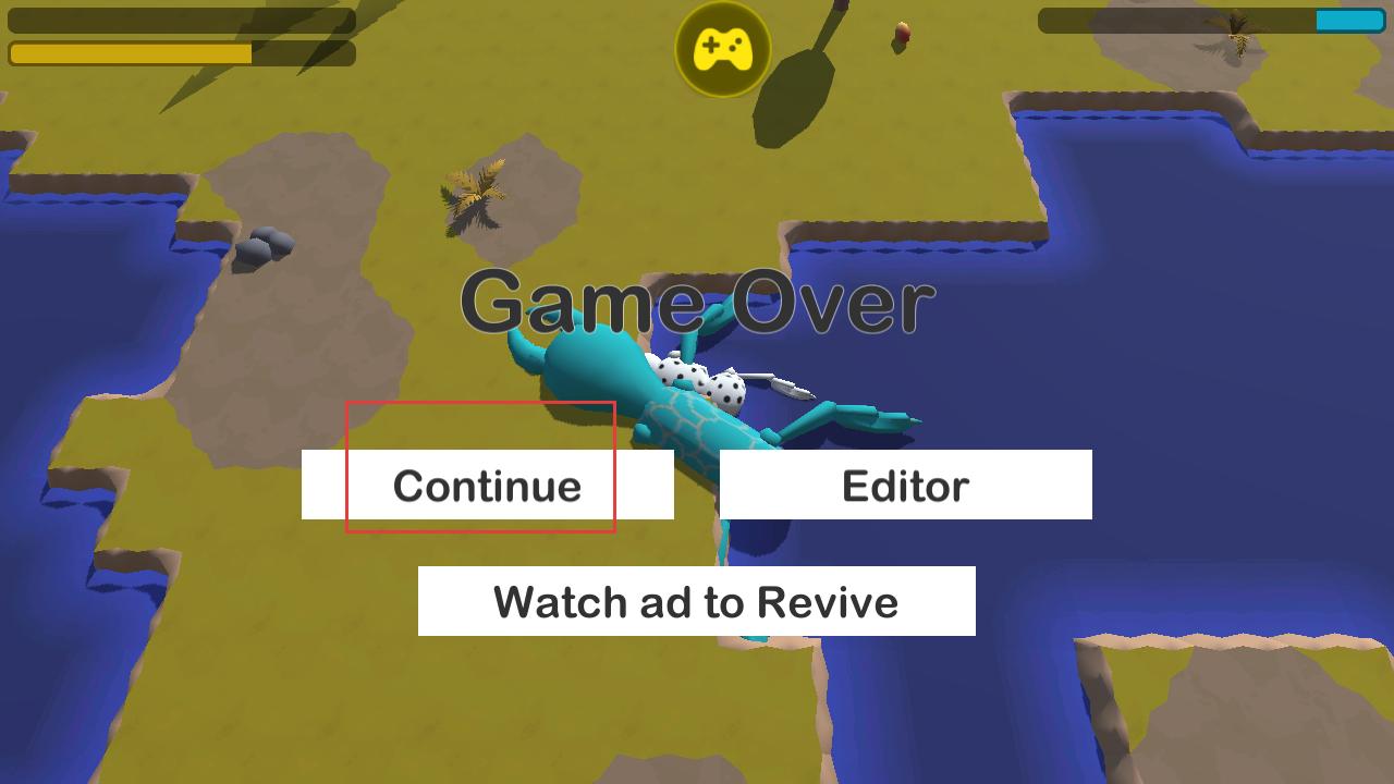 4、若战斗失败,会出现Game Over界面,有Continue、Editor、Watch ad to Revive选项,可选择继续、进入编辑器或看广告复活,再次开启进化之旅。