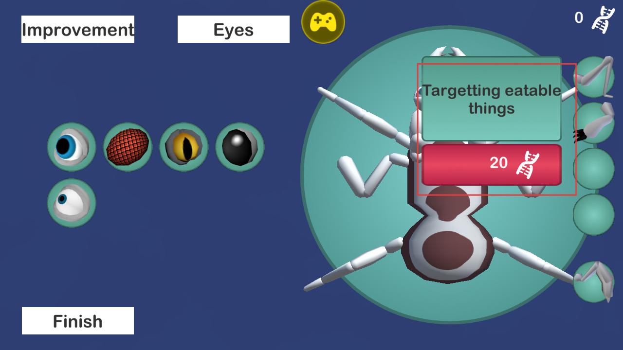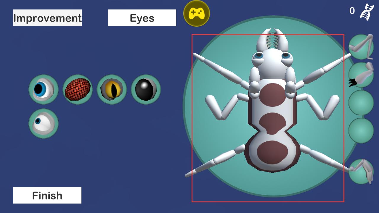 1、在眼睛改进界面,可挑选不同样式的眼睛定制昆虫,选好后点击Finish,完成昆虫眼部进化设定,为生存探索做准备。
