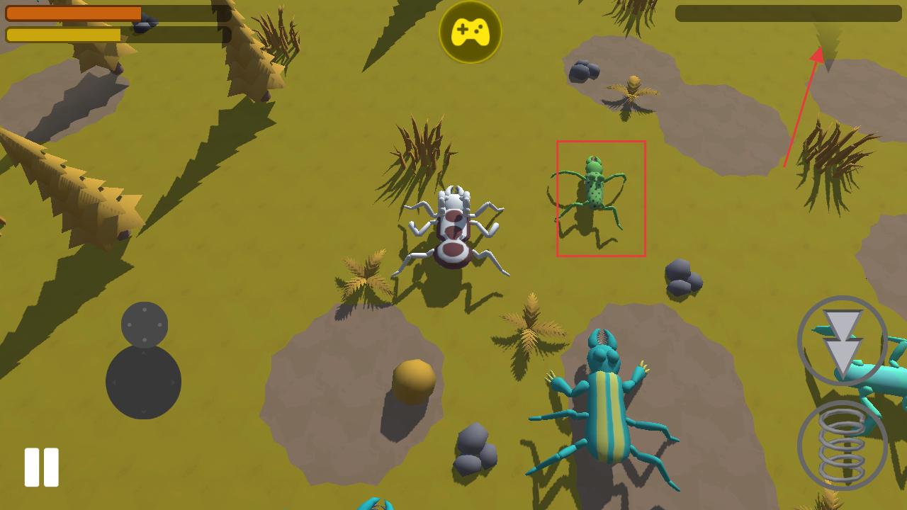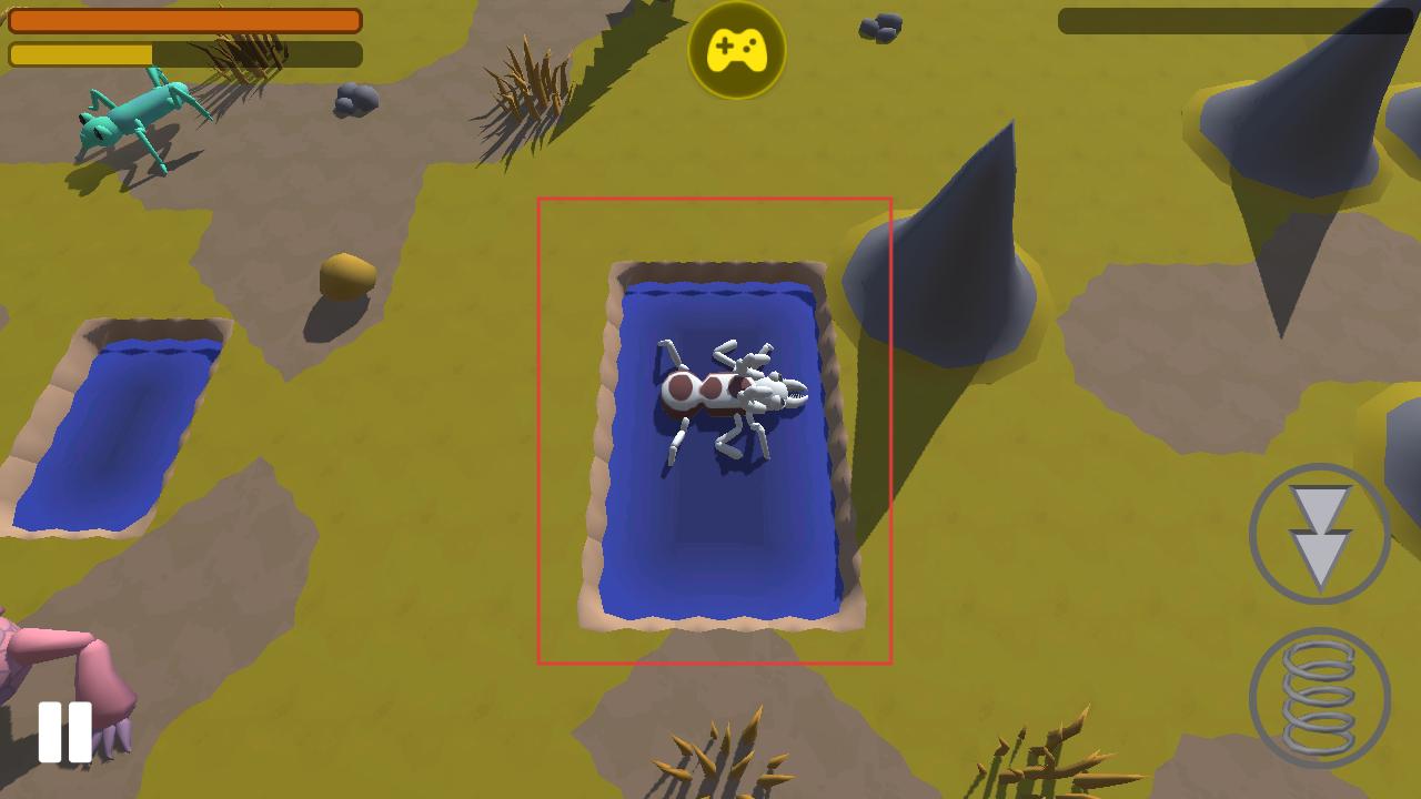 3、操控昆虫在有水域、草丛的地图中移动,周围有其他昆虫,留意自身状态,在微观世界开展生存探索。