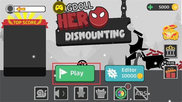 1、进入游戏主界面,点击绿色Play按钮,即可开始游戏,开启用多样方式摧毁火柴人的解压之旅。