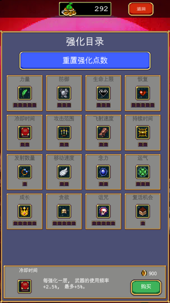 3、局外强化关键:用金币优先提升磁铁范围与贪婪属性,加快资源收集效率。
