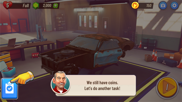 1、初始设置:下载安装后点击“Play”,为修车店命名并完成新手引导,熟悉界面功能与核心玩法逻辑。