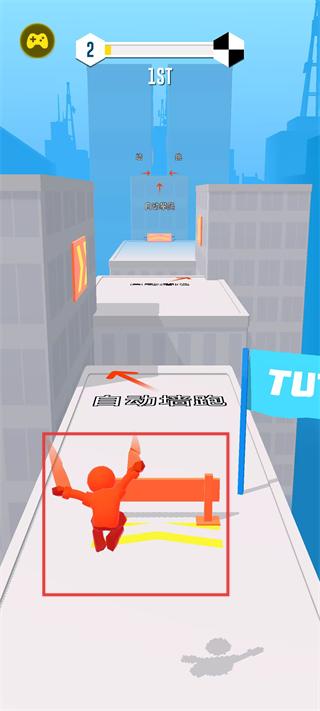 2、角色在建筑墙面上持续奔跑,完成高难度跑酷动作,借助明快的画面风格,在都市背景中推进竞技进度,展现连续跳跃、墙面奔跑的流畅操作。