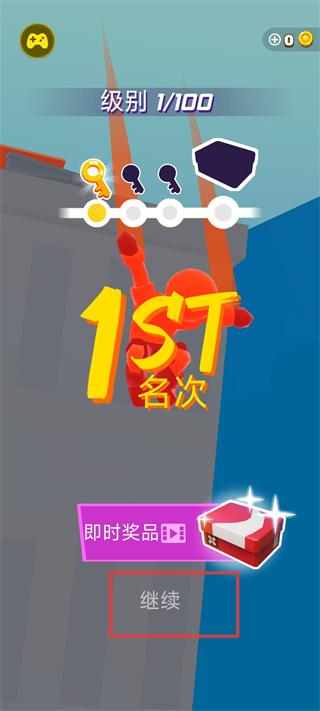 4、跑酷竞技获得第一名后,出现名次奖励界面,可领取即时奖品,点击继续按钮开启下一级别跑酷,冲击赛季排行榜,同时解锁个性化角色装扮,满足表达需求。