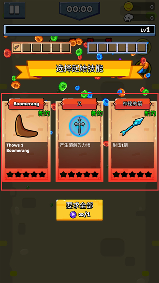 3、选择起始技能,可从回旋镖、叉、神秘的箭中挑选,利用技能开启战斗,应对随机刷新的僵尸潮。