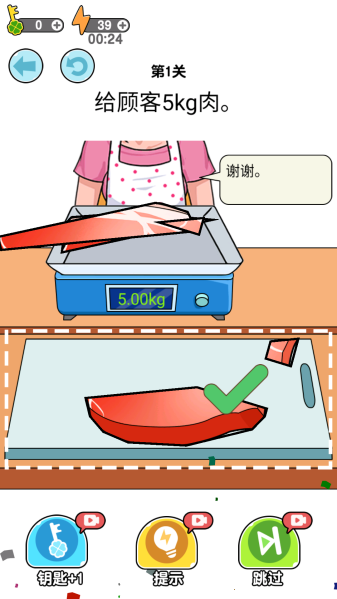 1、点击首页“开始游戏”进入关卡,先观察顾客需求(如指定重量)与砧板上的物品,规划切割思路。