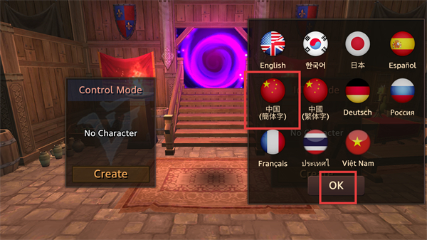 1、进入游戏后先选择语言,界面呈现多种语言选项,同时显示ControlMode和NoCharacter提示,选好语言点击OK,再准备点击Create按钮推进后续流程。
