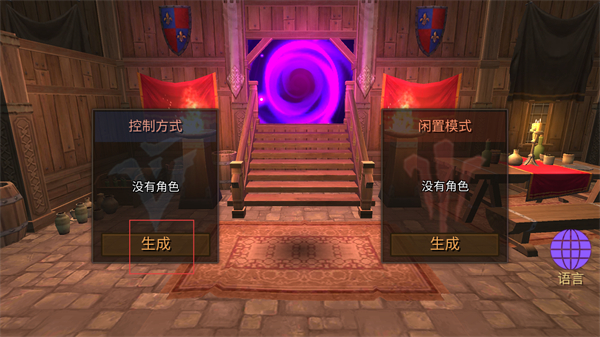 2、完成语言选择后进入界面,左侧是控制方式右侧为闲置模式,两者均提示没有角色,界面上各对应一个生成按钮,可选择对应按钮进行操作。