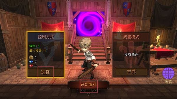 4、创建角色后返回界面,控制方式处显示级别1和最大楼层1,选定该控制方式点击选择,角色会呈现,再点击开始游戏开启地牢探险。