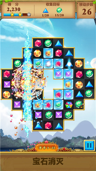 3、目标驱动关卡,每关设定消除任务,含收集指定宝石、清除障碍、达成分数等类型,需在限定步数内完成,剩余步数转化为奖励特效,提升通关收益。