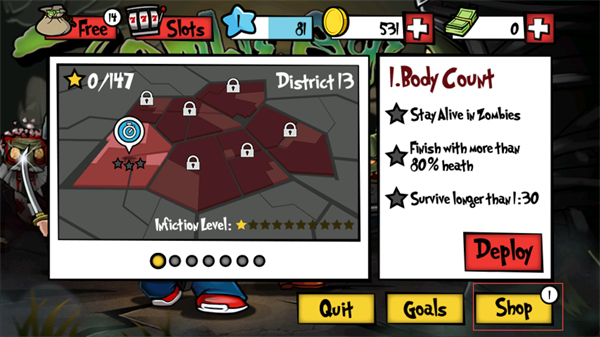 1、查看关卡地图,确认当前可进入的关卡,点击Deploy按钮进入对应的Body Count任务关卡,开始僵尸生存挑战。