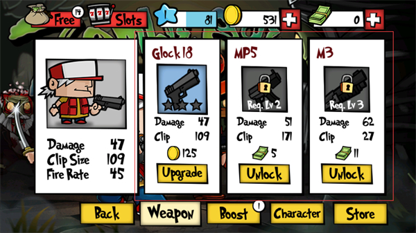 2、在Weapon界面选择Glock18,点击Upgrade按钮提升其属性,增强武器的战斗能力,为后续关卡做准备。