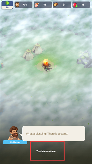 1、点击Touch to continue按钮,推进剧情,进入当前营地场景,开启荒岛生存的流程。