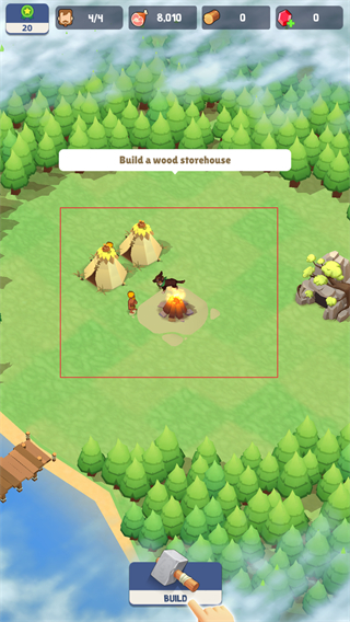 4、在场景中选定位置,点击BUILD按钮建造木材仓库,拓展营地的设施,提升资源存储能力。